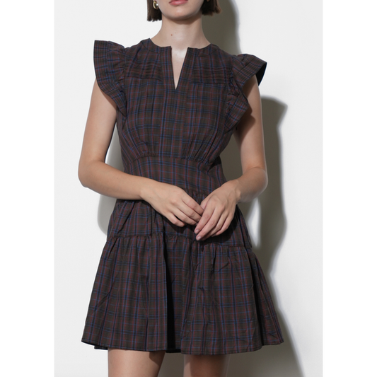 This sweet and stylish mini dress features a timeless plaid pattern in a sophisticated wine color palette. Its defining details are the playful ruffled sleeves, which add a touch of feminine flair and movement to the silhouette.