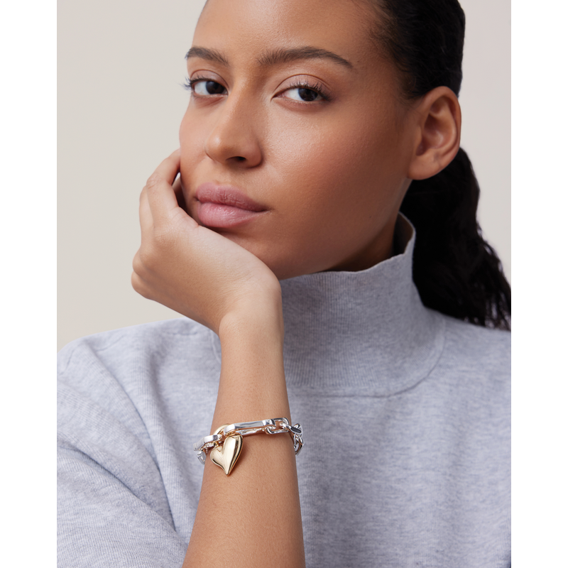 A removable gold heart charm is hooked onto crisp, faceted links. This chain bracelet featuring small carabiner clasps can be split in half and used as a bag charm or keychain. Finished in high-polish gold and silver.