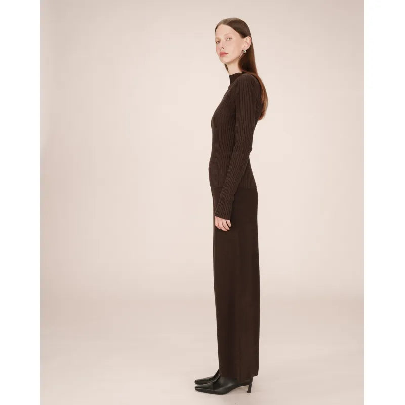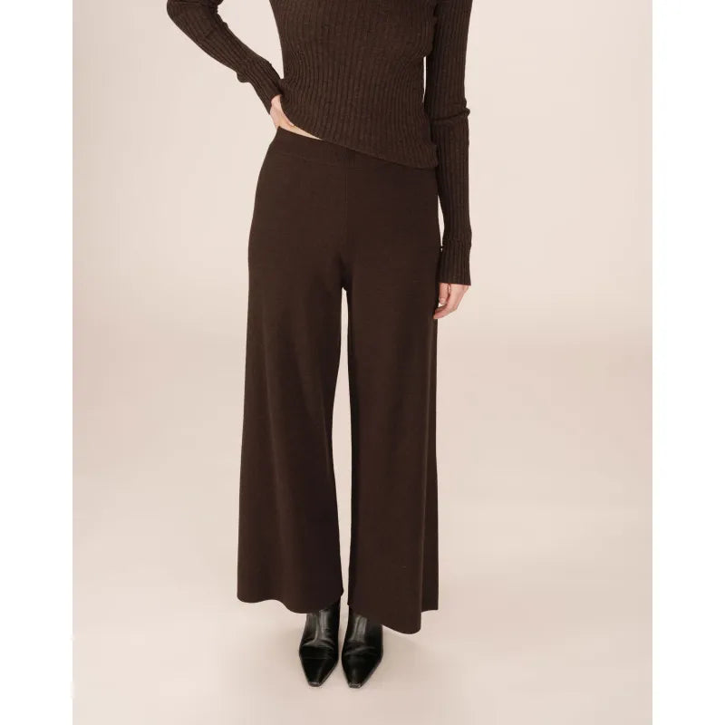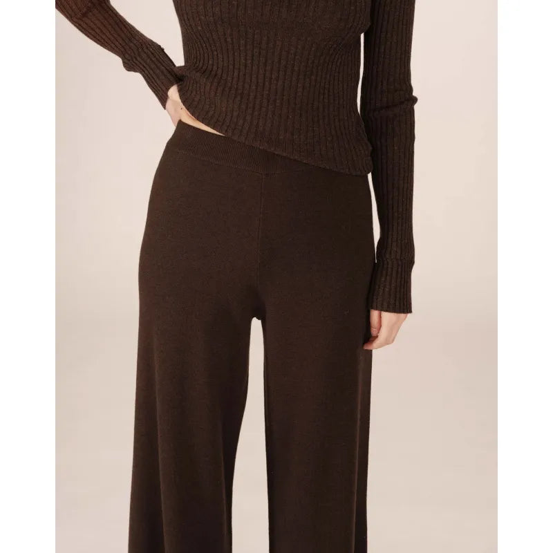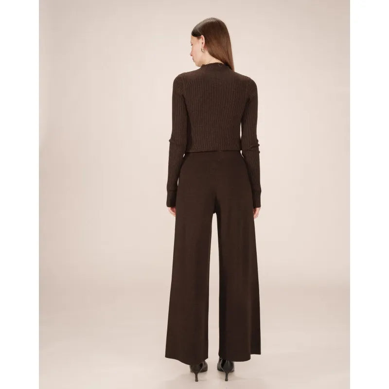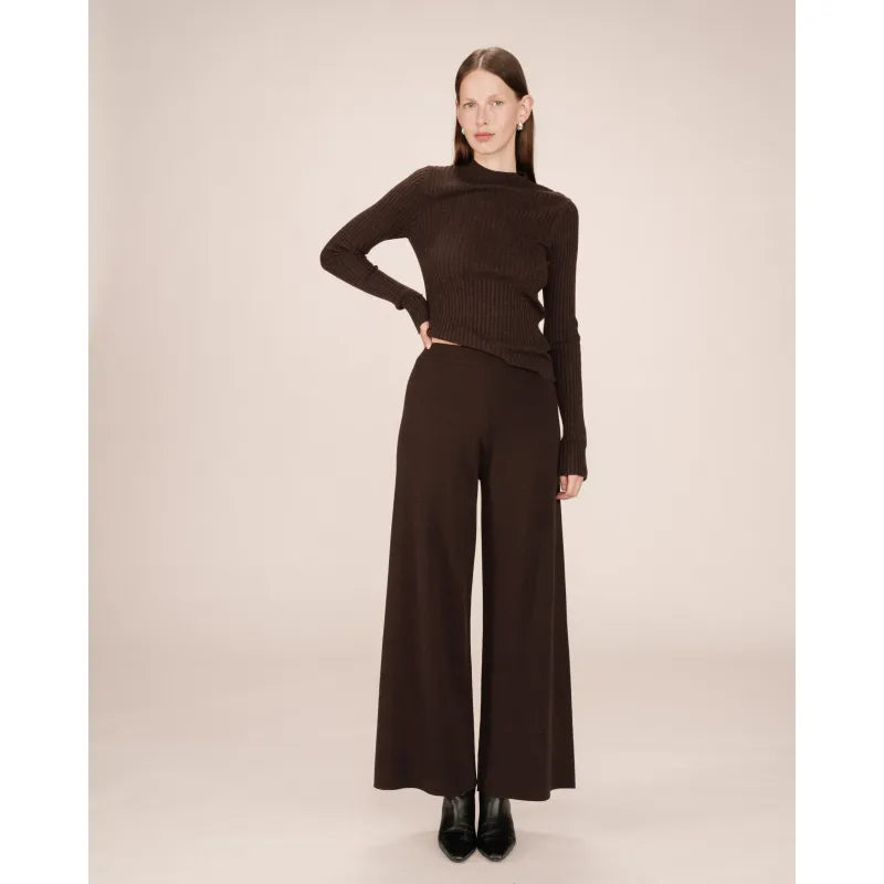 The Sao knit trousers combine comfort and sophistication. The straight, wide-leg cut creates a fluid and elegant silhouette, inspired by classic tailoring and reimagined in a lounge version. The high waist of the straight trousers defines the figure, while the soft knit adds a relaxed touch.