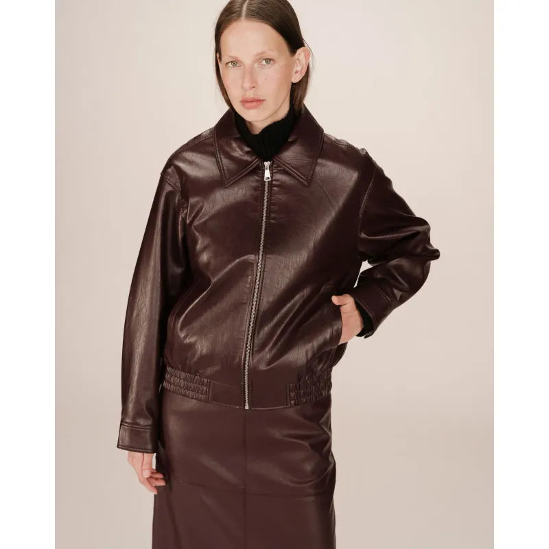 The Sunisa faux leather jacket is a must-have for the autumn/winter season. Its oversized cut combines with long sleeves and a classic collar to create a modern and timeless silhouette. The oversized coat features a front zip closure, side pockets, and a pointed seam detail at the back. The piece is fully lined.
